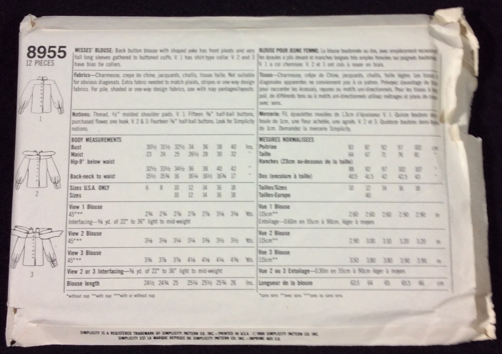 Simplicity 8955 Blouse Button Back Pleated Yoke Front Size 12 Uncut 1988 Ebay
